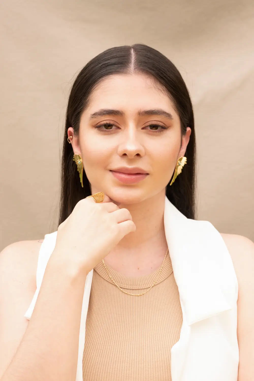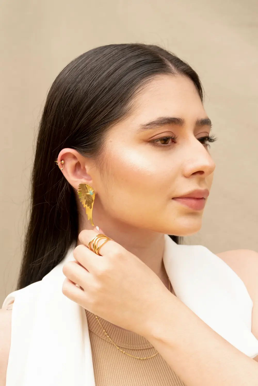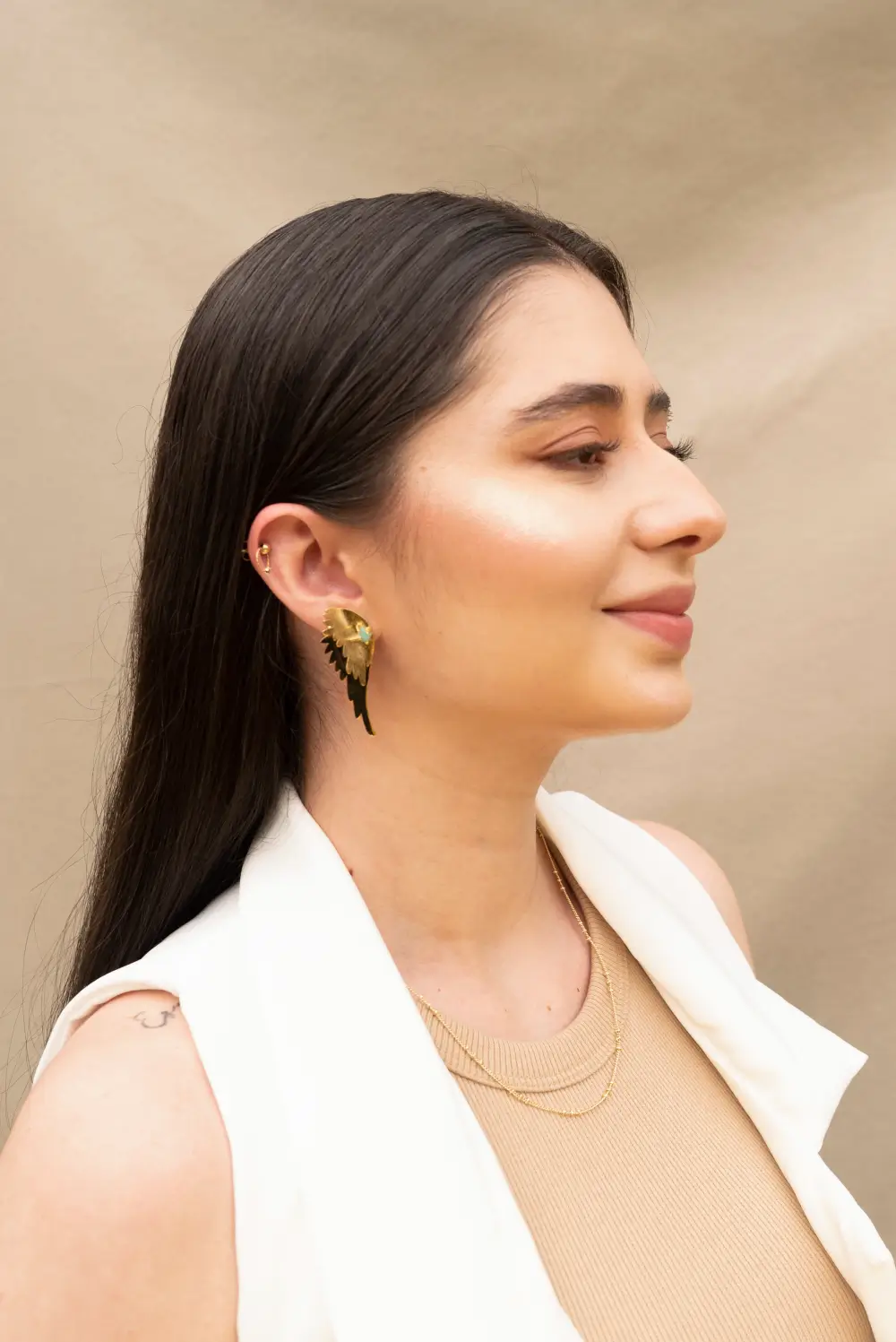 Aretes alas en lamina de bronce con baño de oro de 24K. Piedra: Muralla de esmeralda